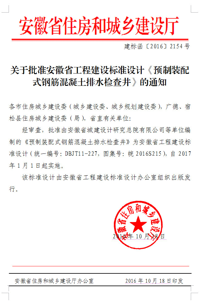 關(guān)于批準(zhǔn)安徽省工程建設(shè)標(biāo)準(zhǔn)設(shè)計《埋地排水用內(nèi)肋增強聚乙烯(PE)螺旋波紋管管道工程選用及安裝圖集》的通知
